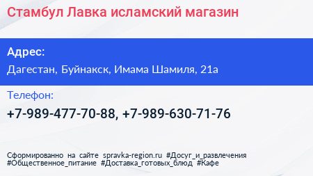 Стамбул Лавка, исламский магазин по адресу Дагестан, Буйнакск, Имама Шамиля, 21а в дальнейшем Организация, размещена в следующих категориях: