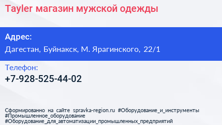 Tayler, магазин мужской одежды по адресу Дагестан, Буйнакск, М. Ярагинского, 22/1 в дальнейшем Организация, размещена в следующих категориях: