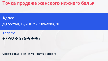Точка продаже женского нижнего белья по адресу Дагестан, Буйнакск, Чкалова, 10 в дальнейшем Организация, размещена в следующих категориях: