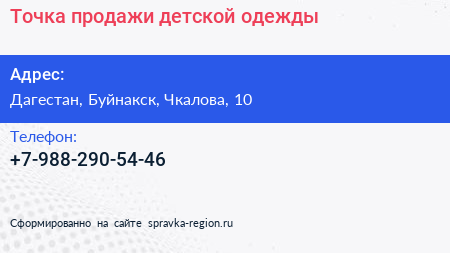 Точка продажи детской одежды по адресу Дагестан, Буйнакск, Чкалова, 10 в дальнейшем Организация, размещена в следующих категориях: