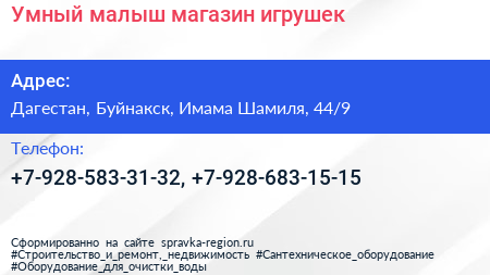Умный малыш, магазин игрушек по адресу Дагестан, Буйнакск, Имама Шамиля, 44/9 в дальнейшем Организация, размещена в следующих категориях: