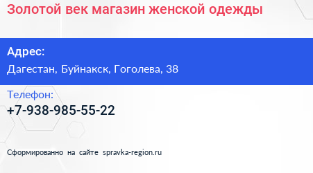 Золотой век, магазин женской одежды по адресу Дагестан, Буйнакск, Гоголева, 38 в дальнейшем Организация, размещена в следующих категориях: