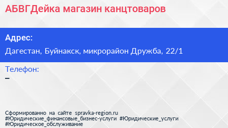 АБВГДейка, магазин канцтоваров по адресу Дагестан, Буйнакск, микрорайон Дружба, 22/1 в дальнейшем Организация, размещена в следующих категориях: