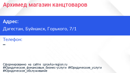 Архимед, магазин канцтоваров по адресу Дагестан, Буйнакск, Горького, 7/1 в дальнейшем Организация, размещена в следующих категориях: