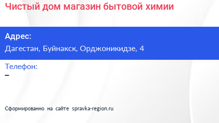 Чистый дом, магазин бытовой химии по адресу Дагестан, Буйнакск, Орджоникидзе, 4 в дальнейшем Организация, размещена в следующих категориях: