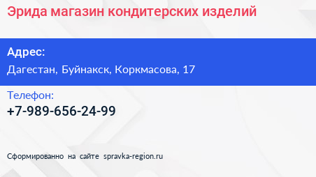 Эрида, магазин кондитерских изделий по адресу Дагестан, Буйнакск, Коркмасова, 17 в дальнейшем Организация, размещена в следующих категориях: