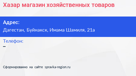 Хазар, магазин хозяйственных товаров по адресу Дагестан, Буйнакск, Имама Шамиля, 21а в дальнейшем Организация, размещена в следующих категориях: