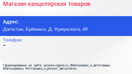 Магазин канцелярских товаров по адресу Дагестан, Буйнакск, Д. Кумухского, 69 в дальнейшем Организация, размещена в следующих категориях: