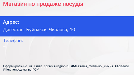 Магазин по продаже посуды по адресу Дагестан, Буйнакск, Чкалова, 10 в дальнейшем Организация, размещена в следующих категориях: