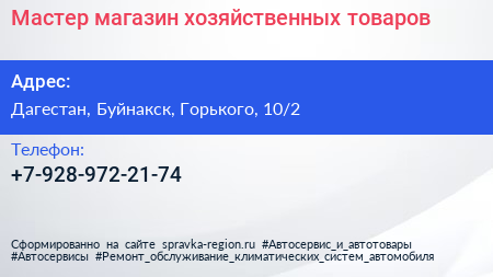 Мастер, магазин хозяйственных товаров по адресу Дагестан, Буйнакск, Горького, 10/2 в дальнейшем Организация, размещена в следующих категориях: