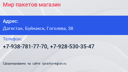 Мир пакетов, магазин по адресу Дагестан, Буйнакск, Гоголева, 38 в дальнейшем Организация, размещена в следующих категориях: