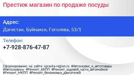 Престиж, магазин по продаже посуды по адресу Дагестан, Буйнакск, Гоголева, 53/1 в дальнейшем Организация, размещена в следующих категориях: