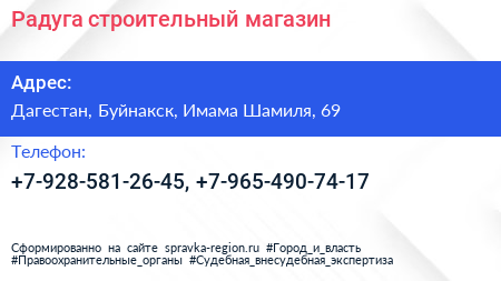 Радуга, строительный магазин по адресу Дагестан, Буйнакск, Имама Шамиля, 69 в дальнейшем Организация, размещена в следующих категориях: