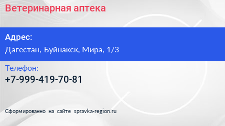 Ветеринарная аптека по адресу Дагестан, Буйнакск, Мира, 1/3 в дальнейшем Организация, размещена в следующих категориях: