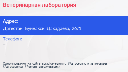 Ветеринарная лаборатория по адресу Дагестан, Буйнакск, Дахадаева, 26/1 в дальнейшем Организация, размещена в следующих категориях: