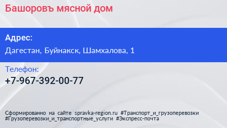 Башоровъ, мясной дом по адресу Дагестан, Буйнакск, Шамхалова, 1 в дальнейшем Организация, размещена в следующих категориях: