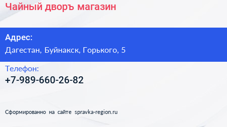 Чайный дворъ, магазин по адресу Дагестан, Буйнакск, Горького, 5 в дальнейшем Организация, размещена в следующих категориях: