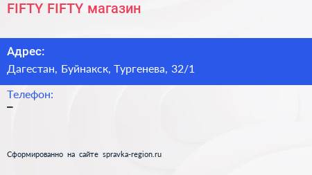 FIFTY FIFTY, магазин по адресу Дагестан, Буйнакск, Тургенева, 32/1 в дальнейшем Организация, размещена в следующих категориях: