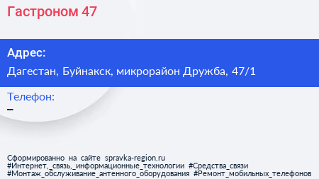 Гастроном №47 по адресу Дагестан, Буйнакск, микрорайон Дружба, 47/1 в дальнейшем Организация, размещена в следующих категориях: