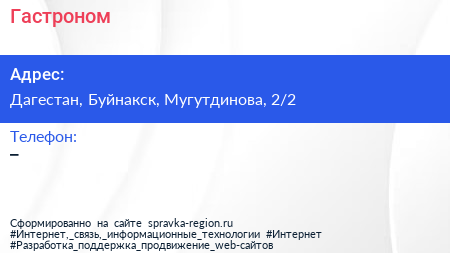 Гастроном по адресу Дагестан, Буйнакск, Мугутдинова, 2/2 в дальнейшем Организация, размещена в следующих категориях: