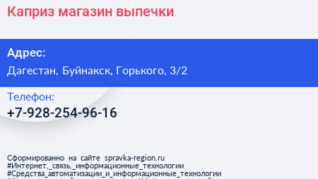 Каприз, магазин выпечки по адресу Дагестан, Буйнакск, Горького, 3/2 в дальнейшем Организация, размещена в следующих категориях: