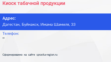 Киоск табачной продукции по адресу Дагестан, Буйнакск, Имама Шамиля, 33 в дальнейшем Организация, размещена в следующих категориях: