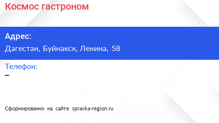 Космос, гастроном по адресу Дагестан, Буйнакск, Ленина, 58 в дальнейшем Организация, размещена в следующих категориях: