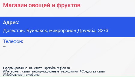 Магазин овощей и фруктов по адресу Дагестан, Буйнакск, микрорайон Дружба, 32/3 в дальнейшем Организация, размещена в следующих категориях: