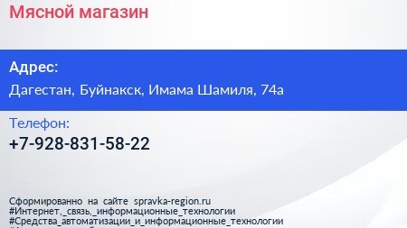 Мясной магазин по адресу Дагестан, Буйнакск, Имама Шамиля, 74а в дальнейшем Организация, размещена в следующих категориях: