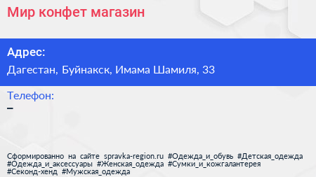 Мир конфет, магазин по адресу Дагестан, Буйнакск, Имама Шамиля, 33 в дальнейшем Организация, размещена в следующих категориях: