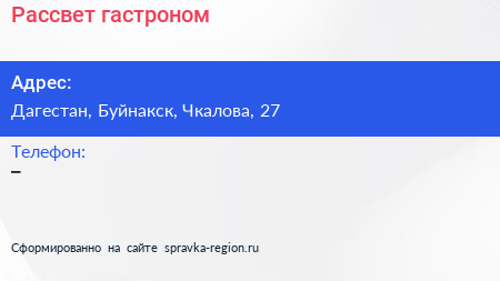 Рассвет, гастроном по адресу Дагестан, Буйнакск, Чкалова, 27 в дальнейшем Организация, размещена в следующих категориях: