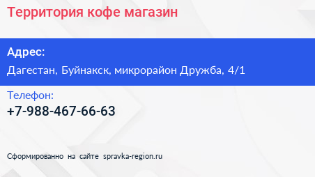 Территория кофе, магазин по адресу Дагестан, Буйнакск, микрорайон Дружба, 4/1 в дальнейшем Организация, размещена в следующих категориях: