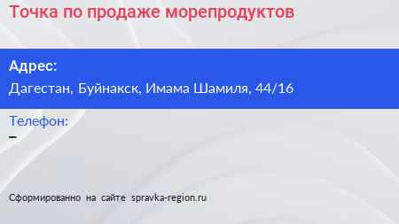 Точка по продаже морепродуктов по адресу Дагестан, Буйнакск, Имама Шамиля, 44/16 в дальнейшем Организация, размещена в следующих категориях: