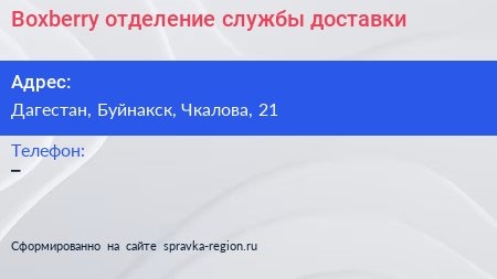 Boxberry, отделение службы доставки по адресу Дагестан, Буйнакск, Чкалова, 21 в дальнейшем Организация, размещена в следующих категориях: