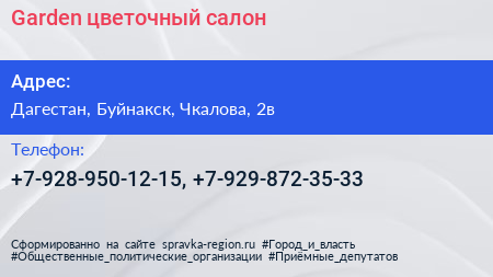 Garden, цветочный салон по адресу Дагестан, Буйнакск, Чкалова, 2в в дальнейшем Организация, размещена в следующих категориях: