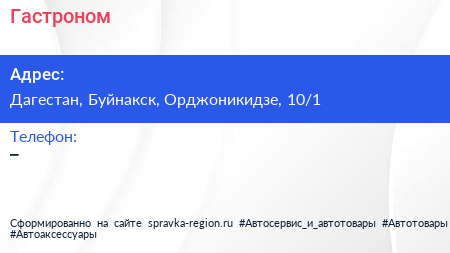 Гастроном по адресу Дагестан, Буйнакск, Орджоникидзе, 10/1 в дальнейшем Организация, размещена в следующих категориях: