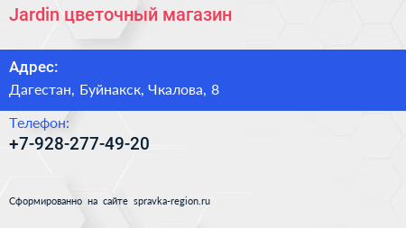 Jardin, цветочный магазин по адресу Дагестан, Буйнакск, Чкалова, 8 в дальнейшем Организация, размещена в следующих категориях: