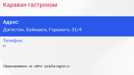 Караван, гастроном по адресу Дагестан, Буйнакск, Горького, 31/4 в дальнейшем Организация, размещена в следующих категориях: