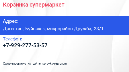 Корзинка, супермаркет по адресу Дагестан, Буйнакск, микрорайон Дружба, 23/1 в дальнейшем Организация, размещена в следующих категориях: