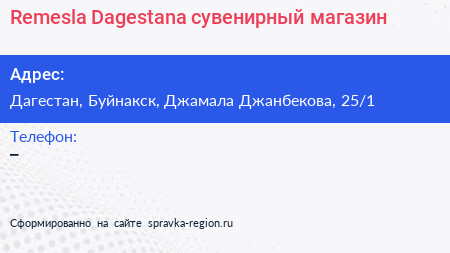 Remesla Dagestana, сувенирный магазин по адресу Дагестан, Буйнакск, Джамала Джанбекова, 25/1 в дальнейшем Организация, размещена в следующих категориях: