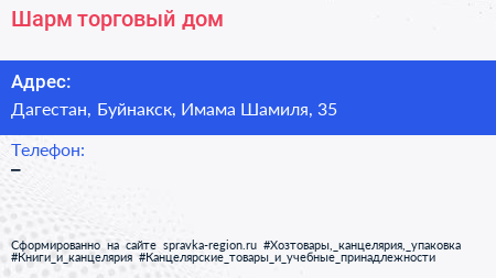 Шарм, торговый дом по адресу Дагестан, Буйнакск, Имама Шамиля, 35 в дальнейшем Организация, размещена в следующих категориях: