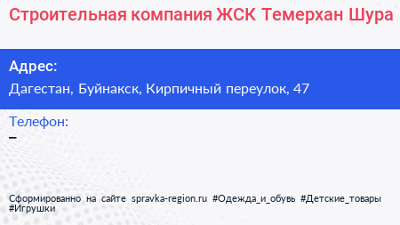 Строительная компания, ЖСК Темерхан Шура по адресу Дагестан, Буйнакск, Кирпичный переулок, 47 в дальнейшем Организация, размещена в следующих категориях: