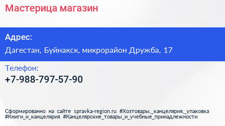 Мастерица, магазин по адресу Дагестан, Буйнакск, микрорайон Дружба, 17 в дальнейшем Организация, размещена в следующих категориях: