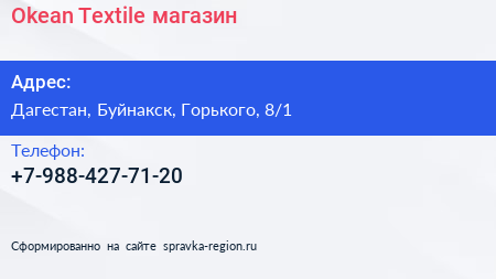 Okean Textile, магазин по адресу Дагестан, Буйнакск, Горького, 8/1 в дальнейшем Организация, размещена в следующих категориях: