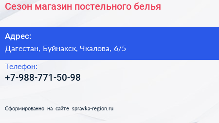 Сезон, магазин постельного белья по адресу Дагестан, Буйнакск, Чкалова, 6/5 в дальнейшем Организация, размещена в следующих категориях: