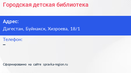 Городская детская библиотека по адресу Дагестан, Буйнакск, Хизроева, 18/1 в дальнейшем Организация, размещена в следующих категориях: