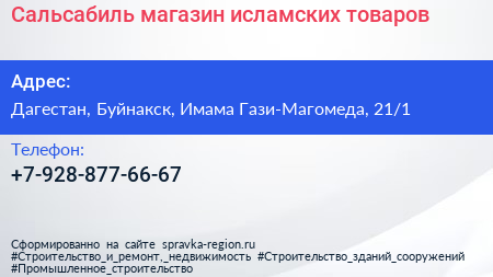 Сальсабиль, магазин исламских товаров по адресу Дагестан, Буйнакск, Имама Гази-Магомеда, 21/1 в дальнейшем Организация, размещена в следующих категориях: