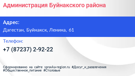 Администрация Буйнакского района по адресу Дагестан, Буйнакск, Ленина, 61 в дальнейшем Организация, размещена в следующих категориях: