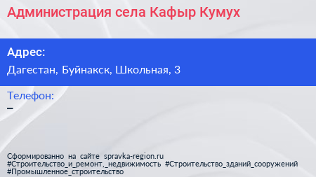 Администрация села Кафыр-Кумух по адресу Дагестан, Буйнакск, Школьная, 3 в дальнейшем Организация, размещена в следующих категориях: