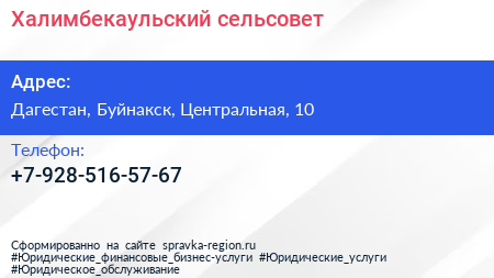 Халимбекаульский сельсовет по адресу Дагестан, Буйнакск, Центральная, 10 в дальнейшем Организация, размещена в следующих категориях: